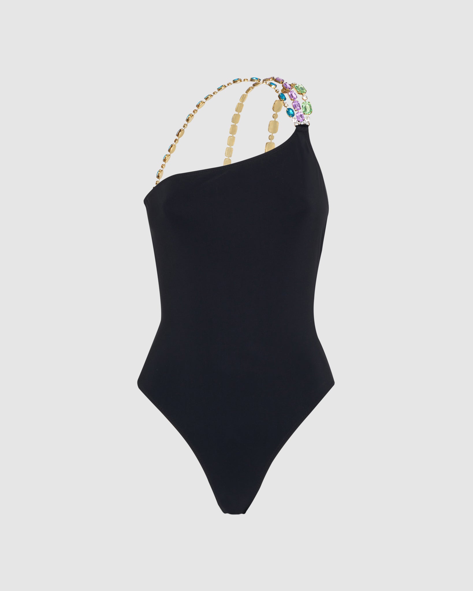 GCDS one piece one-shoulder swimsuit with an asymmetrical cut. Left shoulder strap with triple chain with different colored stones. GCDS logo print on the center back.