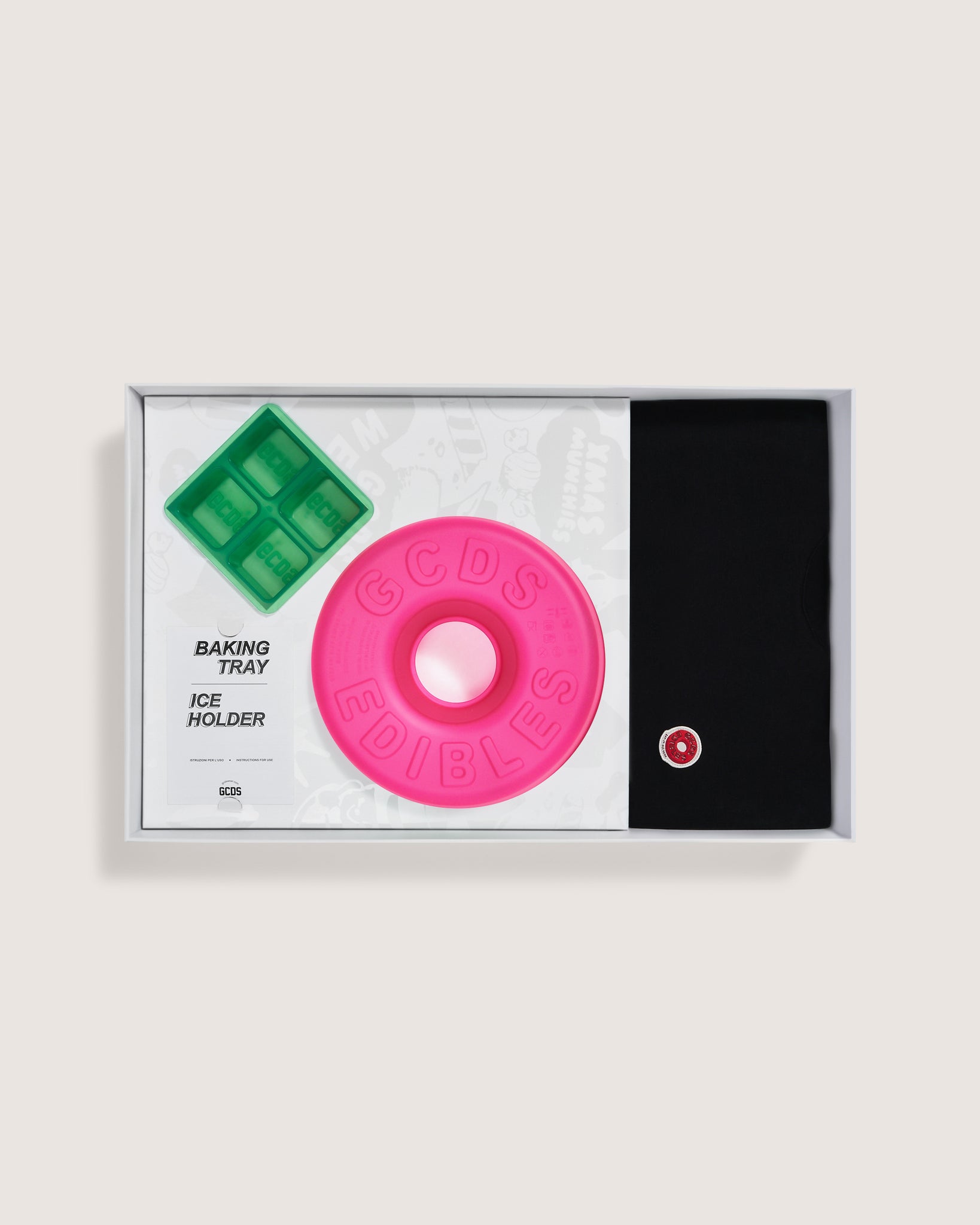 Skip to contentThe candy themed gift box includes an ‘edibles’ printed cotton t-shirt, an ice cube tray and a ‘GCDS edibles’ cake mold.